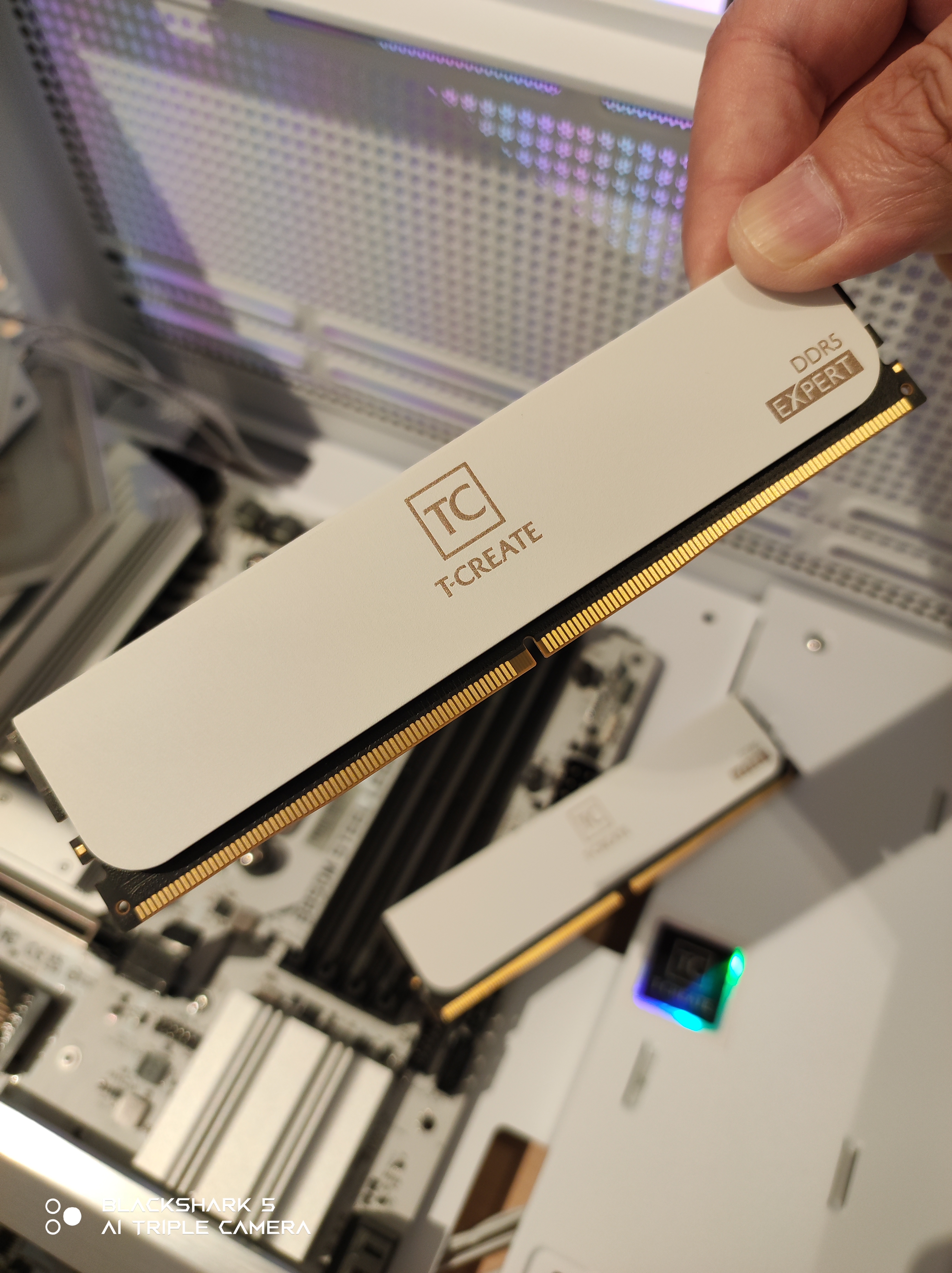 マザーボードのメモリスロットに、Team T-CREATE DDR5 32GBを「カチッ」と音がするまで差し込みます。