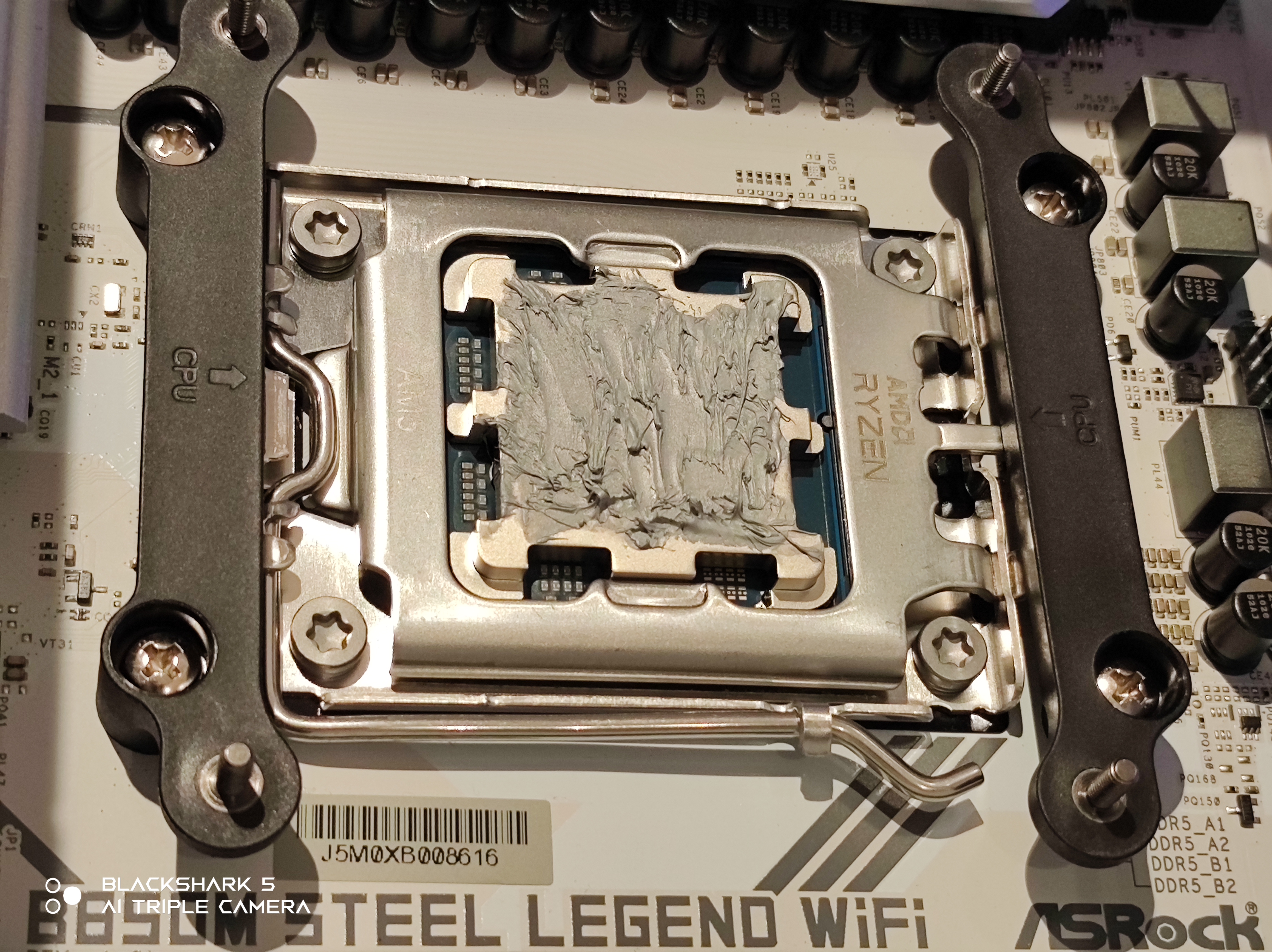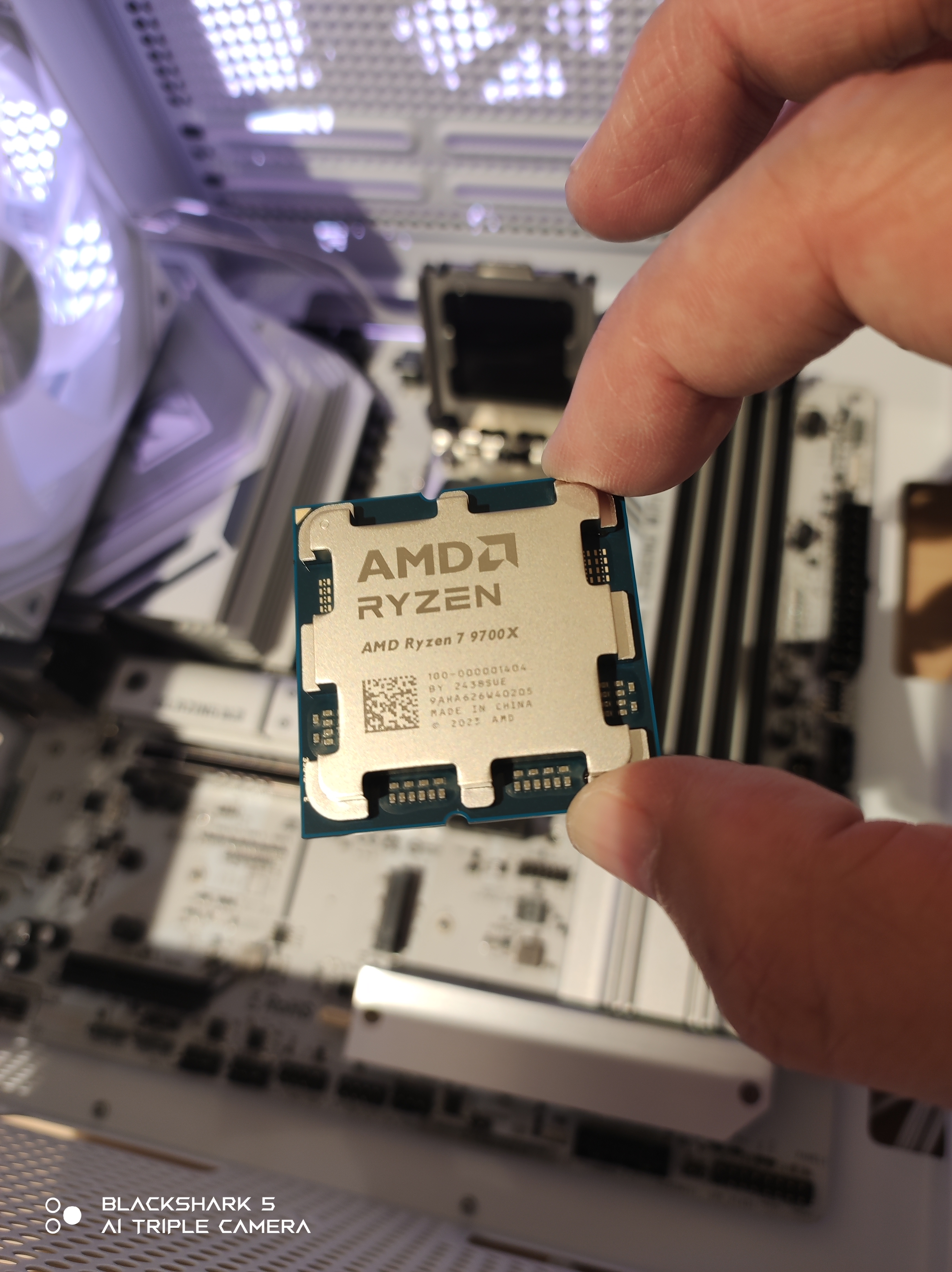 マザーボード中央のCPUソケットに、AMD Ryzen 7 9700Xをセットします。
